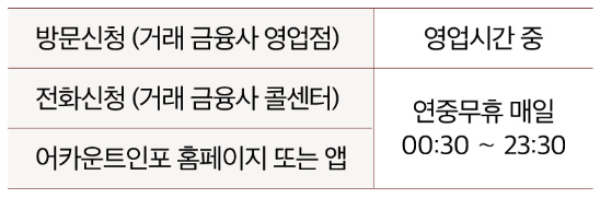 본인계좌 일괄지급정지 서비스는 연중무휴 이용 가능하며 온라인과 오프라인 2가지 채널을 통해 이용이 가능합니다.