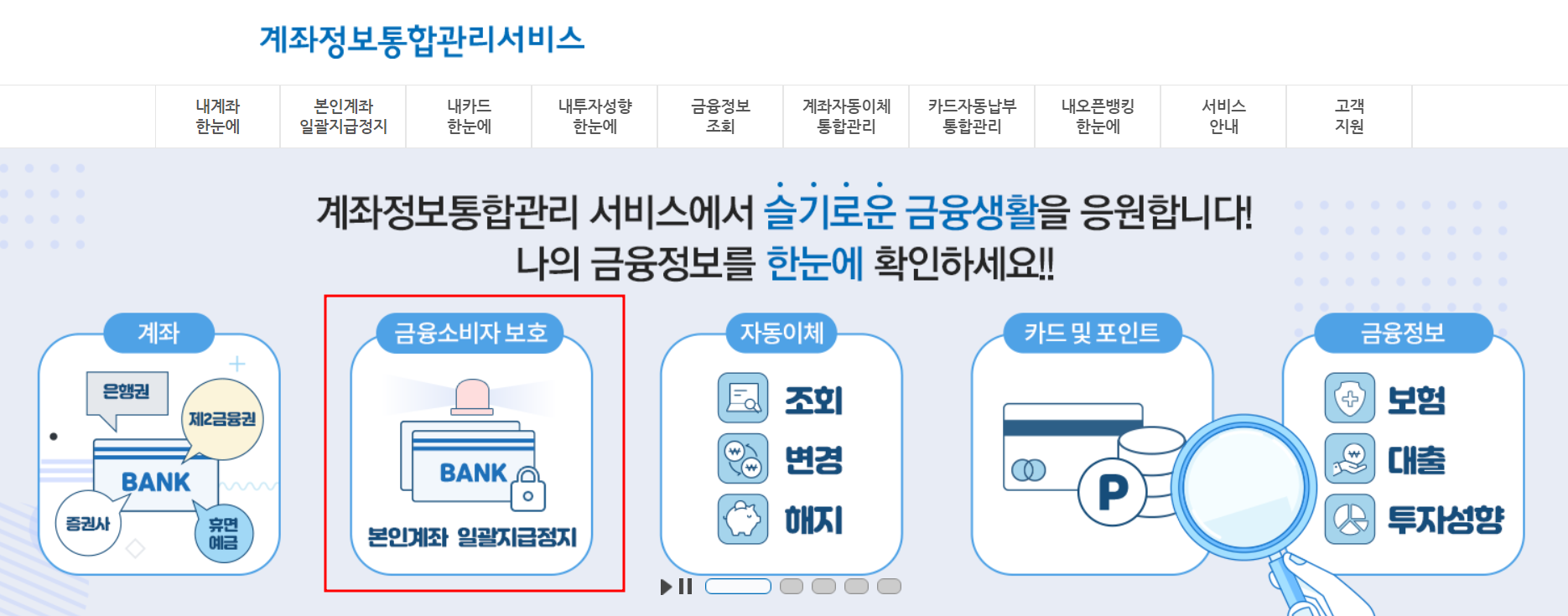 본인계좌 일괄지급정지 서비스를 이용해서 본인 명의로 개설된 모든 계좌를 일괄 또는 선택하여 지급정지 할 수 있습니다.